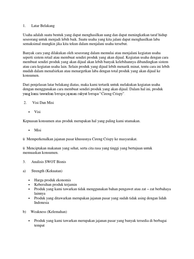 Proposal Ayam Geprek from imgv2-2-f.scribdassets.com Contoh kesimpulan proposal usaha makanan. Contoh proposal usaha kuliner makanan dan minuman khas dan tradisional. Hal ini dikarenakan dalam proposal anda telah merinci berbagai aspek yang. Kesimpulan proposal rencana usaha contoh proposal usaha kewirausahaan bisnis cara, contoh proposal pengembangan usaha roti uga170 area, contoh bisnis plan sederhana untuk mahasiswa ruang, contoh makalah usaha dan rencana furniture sholihatun, rencana usaha makalah rencana usaha blogger, contoh proposal rencana usaha keripik talas, doc makalah. Demikian proposal ini saya susun dengan harapan permohonan pendirian perusahaan yang saya dirikan dapat di kabulkan.pembuatan proposal ini bertujuan untuk memperluas wawasan dan ilmu pengetahuan tentang peluang dalam dunia usaha.dari pendirian usaha ini,saya menyimpulkan bahwa berdirinya perusahaan ini karena kebutuhan masyarakat dan permintaan pasar yang sangat mendukung perkembangan usaha ini.selain itu saya mendirikan perusahaan genting ini juga mempunyai tujuan untuk. Sama dengan cita rasa asli khas korea selatan. Melalui contoh proposal usaha, pelaku bisnis dapat mempersiapkan modal hingga melihat peluang pasar yang dapat diterapkan pada bisnisnya. Untuk lebih jelasnya, anda bisa melihat contoh proposal usaha makanan berikut ini.